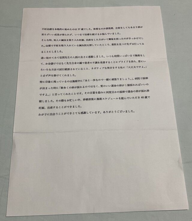 特に印象に残っているのは施術中に「あと一歩なので一緒に頑張りましょう。」、病院で採卵が決まった時に「数多くの卵が採れるのではなく、質のいい運命の卵が1個採れればいいのですよ。」と言ってくれたことです。その言葉を励みに何度目かの採卵で運命の卵が採れ移植しました。その際もお忙しい中、移植前後に施術スケジュールを組んでいただき40歳で妊娠、出産することができました。